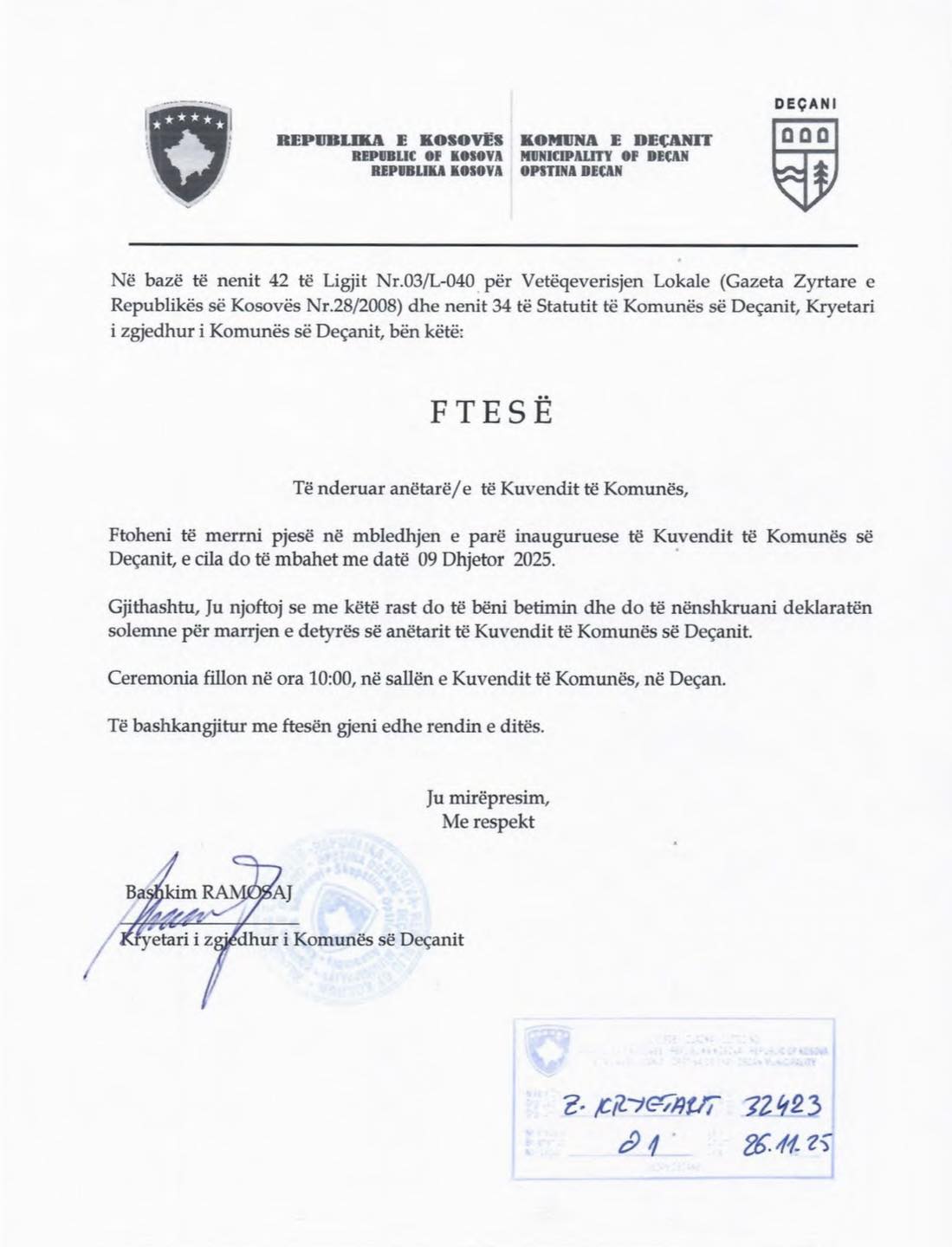 Të nderuar anëtarë të Kuvendit të Komunës, ftoheni të merrni pjesë në mbledhjen e parë inauguruesе të Kuvendit të Komunës së Deçanit.